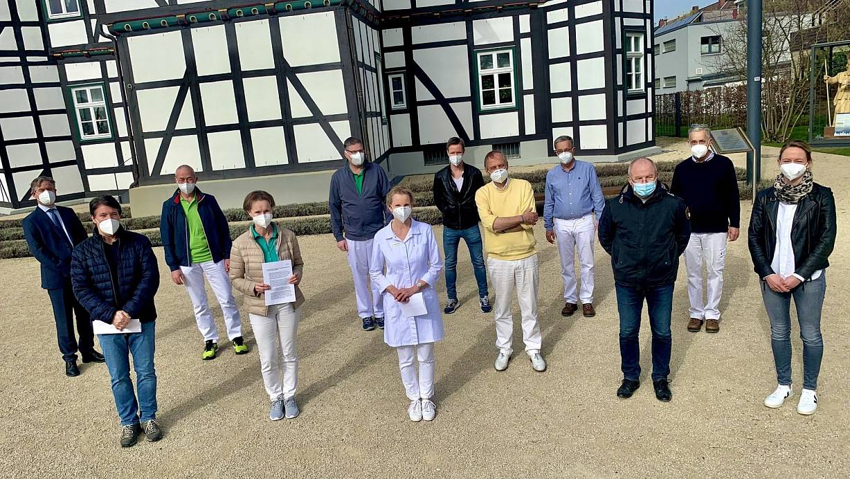 Hövelhofs Bürgermeister Michael Berens (v. l.) und die Mediziner Ulrich Smolnik, Markus Krois, Renate Froese, Ulrich Behrends, Annette Rodenkirchen, Stefan Sondermann, Peter Engeling, Georg Schneider, Mirko Klawohn, Martin Schneider und Eva-Maria Richter machen sich für Corona-Impfungen in Hausarztpraxen stark | © Jens Reddeker