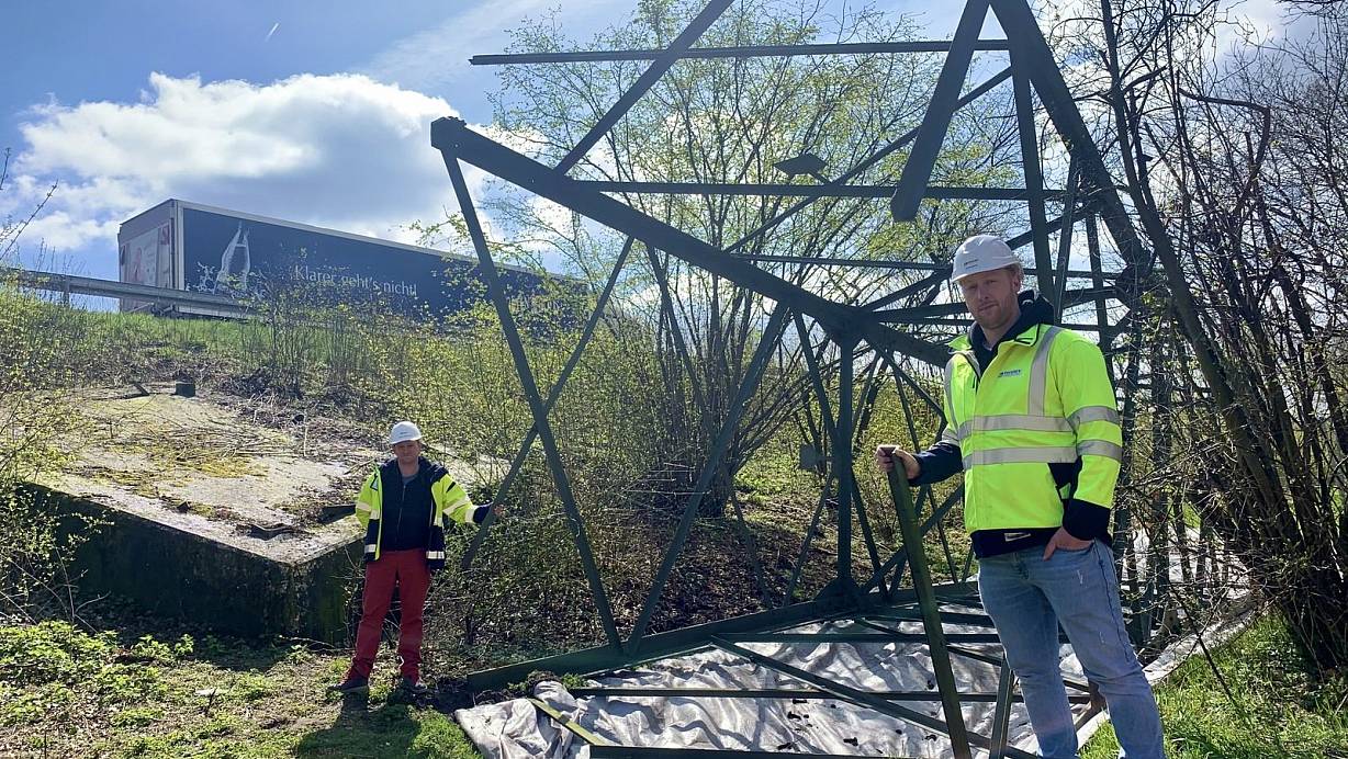 Auch entlang der A 33 hat Michel Schneebergs (r.) Team die Strommasten abgebaut. Links neben Tennet-Sprecher Markus Lieberknecht ist das schräge Mast-Fundament zu sehen. Es bleibt hier so bestehen, um die Stabilität der Autobahn nicht zu gefährden. | © Jens Reddeker