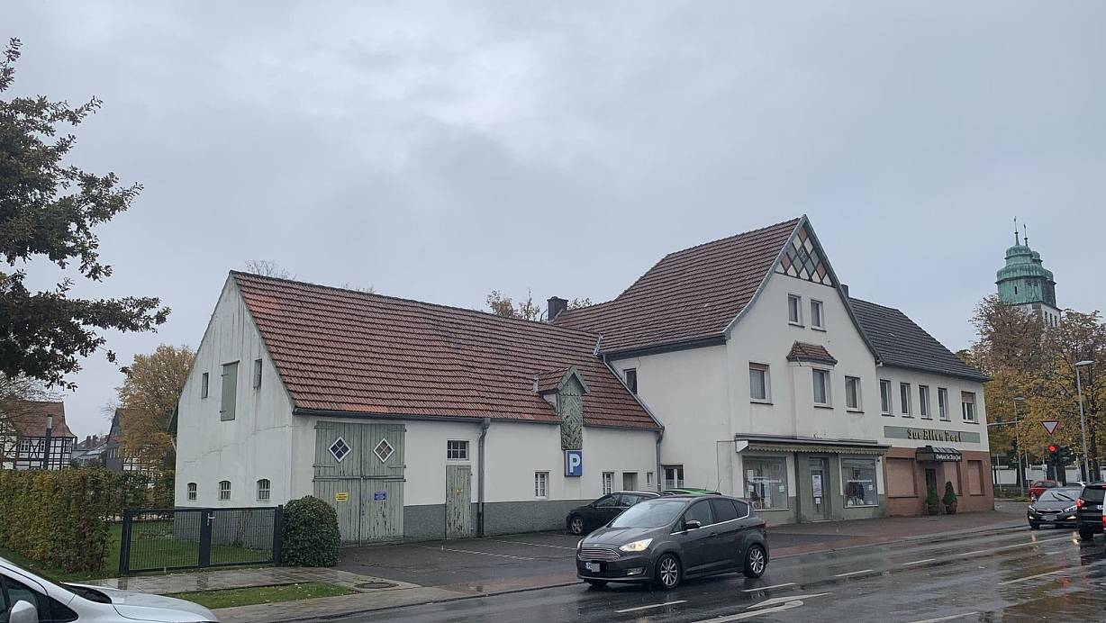 Jahrzehntelang war das Gasthaus „Zur alten Post“ Dorfkneipe und Vereinslokal des Hövelhofer SV. Seit 2001 ist es geschlossen. Links ist im Hintergrund das Jagdschloss zu erkennen. | © Jens Reddeker