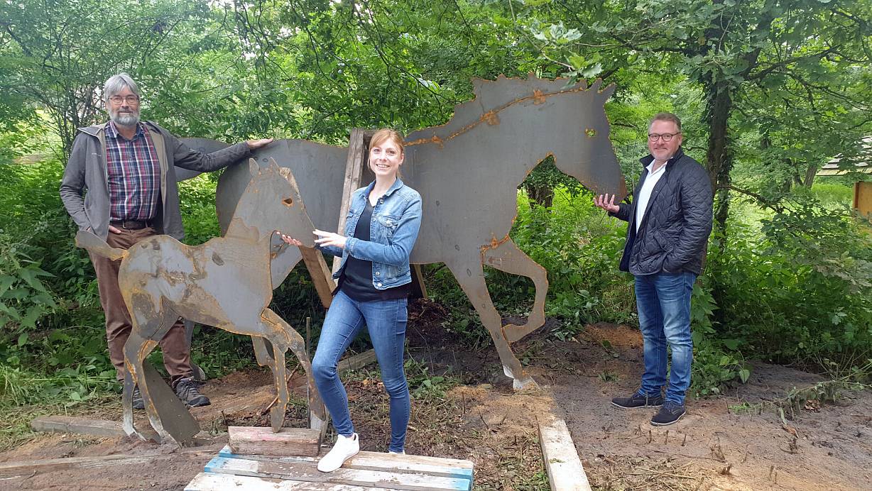 Projektleiter Peter Rüther von der Biologischen Station (v.l.), Helena Kottowski von der Hövelhofer Stabsstelle Wirtschaft und Marketing und Koordinator Thomas Westhof vom Projekt „Senne für alle Sinne" stellen die Skulptur „Senner Pferde" vor. | © Regina Brucksch