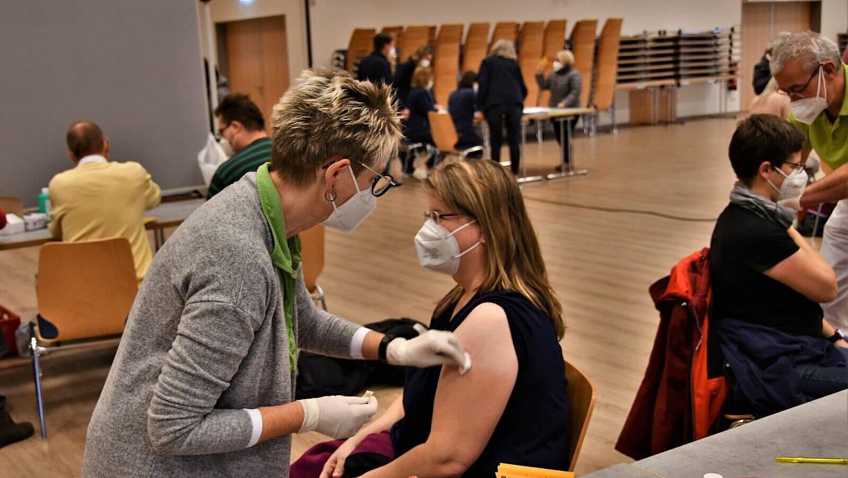 Hildegard Stallein gibt die Corona-Impfung in den Arm einer Patientin. Im Hintergrund warten bereits die nächsten Impfwilligen an der Anmeldung. | © Raphael Athens
