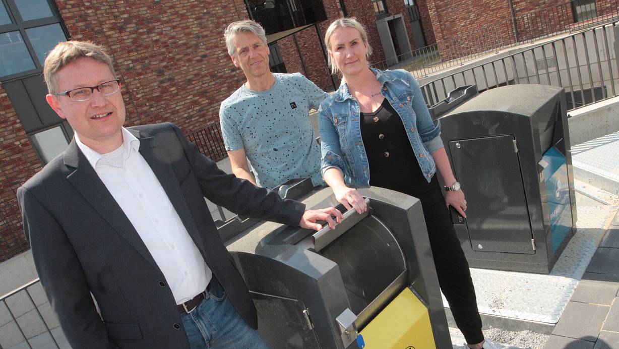 Hövelhofs Kämmerer Andreas Schwarzenberg sowie Bauleiter Heiko Wurzler und Projektleiterin Annika Wendt von der Kreyer Holding präsentieren das neue Entsorgungssystem. | © Uwe Müller