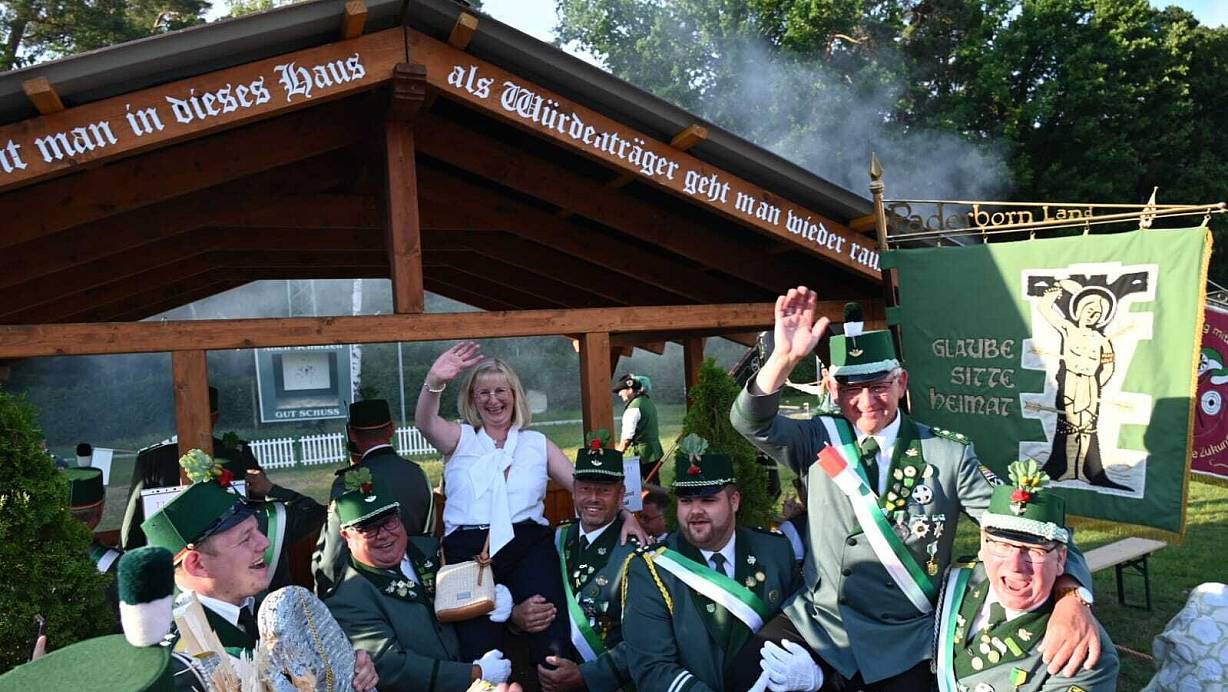 Hövelhof (ra/um). Mit Spannung wurde am Sonntag das Vogelschießen in Hövelhof erwartet. Um 19.48 Uhr schoss Matthias Vonderheide mit dem 168. Schuss den Vogel ab und ist neuer Schützenkönig der St.-Hubertus-Schützenbruderschaft. Er löst damit Frank Bröckling ab, der zusammen mit Heidi Auster pandemiebedingt drei Jahre lang die Schützen anführte. Vonderheide aus der Klausheide-Kompanie wird seine Frau Annette zur Königin nehmen.