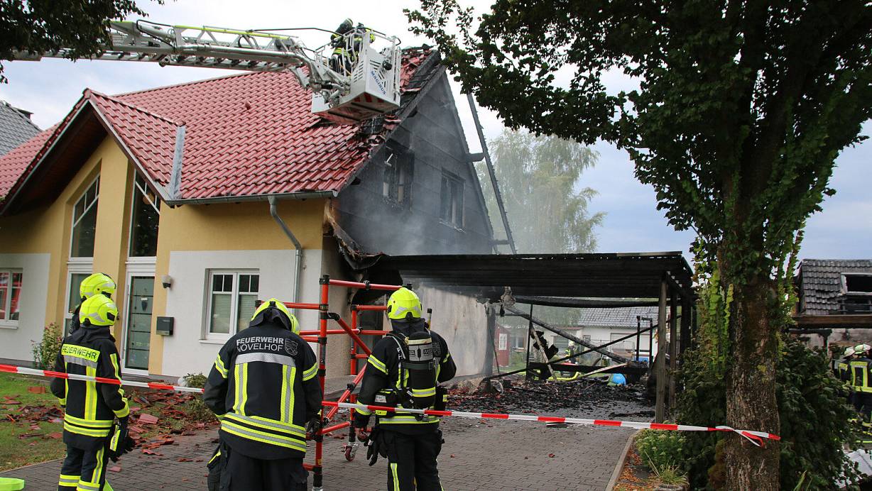 Aus ungeklärte Ursache war an der Alten Poststraße in Hövelhof ein Carport in Brand geraten, die Flammen breiteten sich auf einen zweiten Carport und zwei Häuser aus. | © Feuerwehr