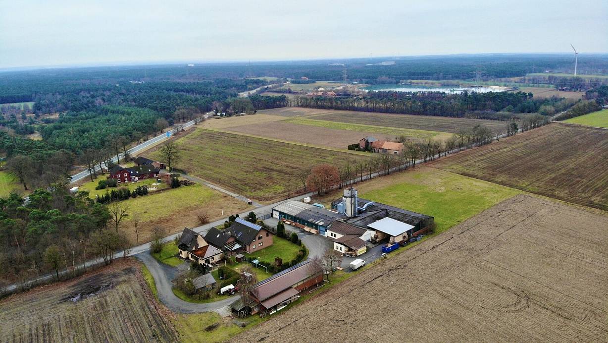Hier entsteht der Gewerbepark Senne, am Horizont befindet sich Hövelhof. Der Betrieb und das Privathaus an der Paderborner Straße (l.) bleiben stehen. Die Bäume am Lippstädter Weg sind mittlerweile gefällt. | © Jens Reddeker