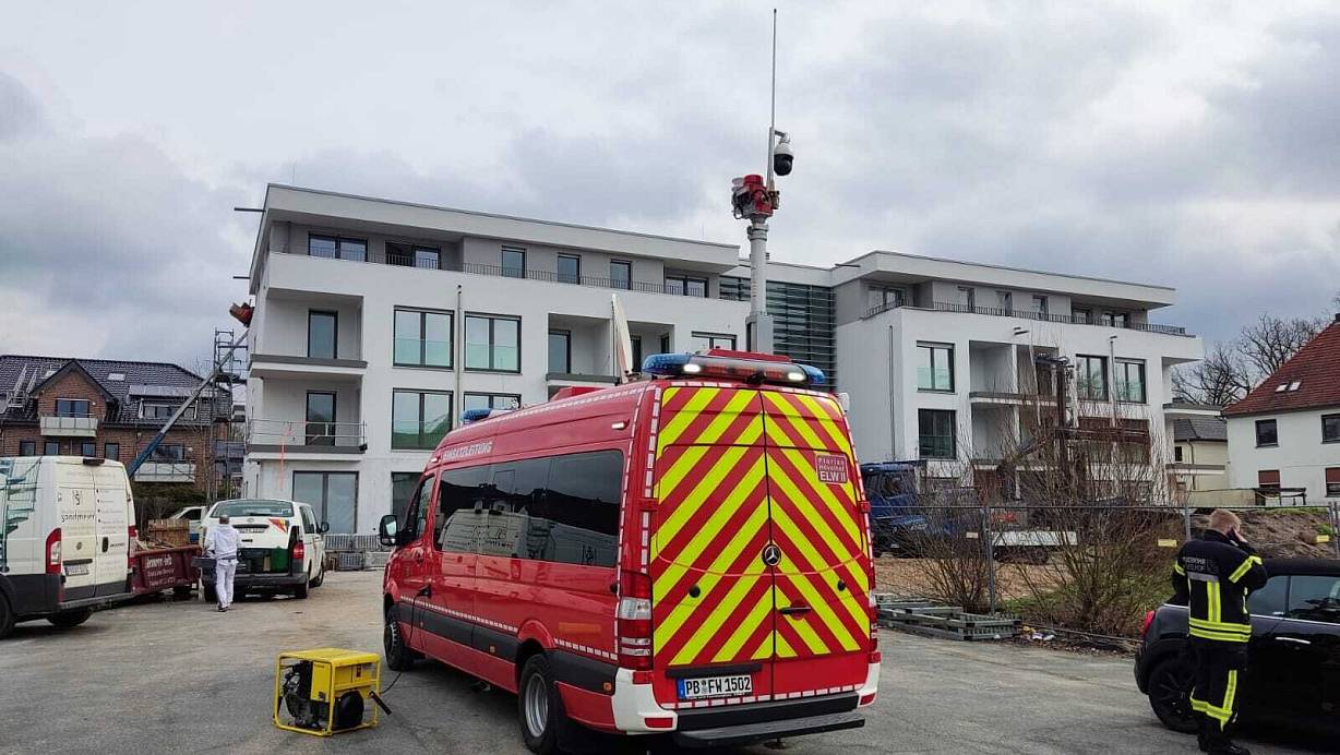 Rund 30 Feuerwehrleute sind im Einsatz. Der Verletzte wird mit der Schleifkorbtrage durchs Treppenhaus getragen. Am Samstag ereignete sich bereits ein ähnlicher Unfall.