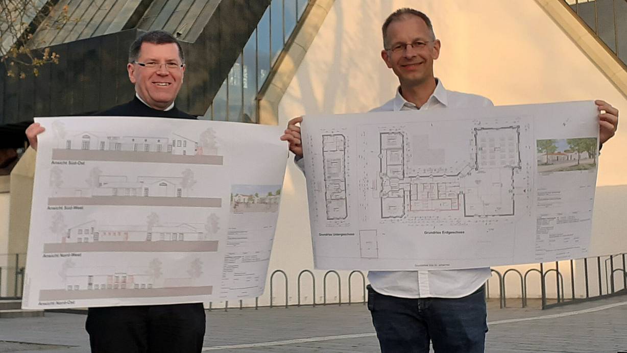 Pfarrer Bernd Haase (l.) und Gemeindereferent Bertold Filthaut machen die Pläne für das neue Pfarrheim jetzt in der Kirche öffentlich. | © Kirchengemeinde St. Johannes Nepomuk Hövelhof