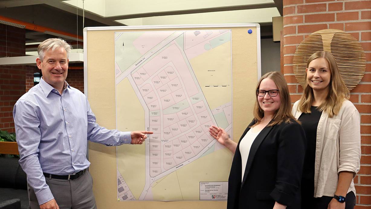 Bürgermeister Michael Berens, Andrea Niermeier und Carolin Rüther vom Bauamt der Gemeinde (v.l.) präsentieren den Teilungsentwurf für das Neubaugebiet Portemeiers Kreuz. | © Gemeinde Hövelhof