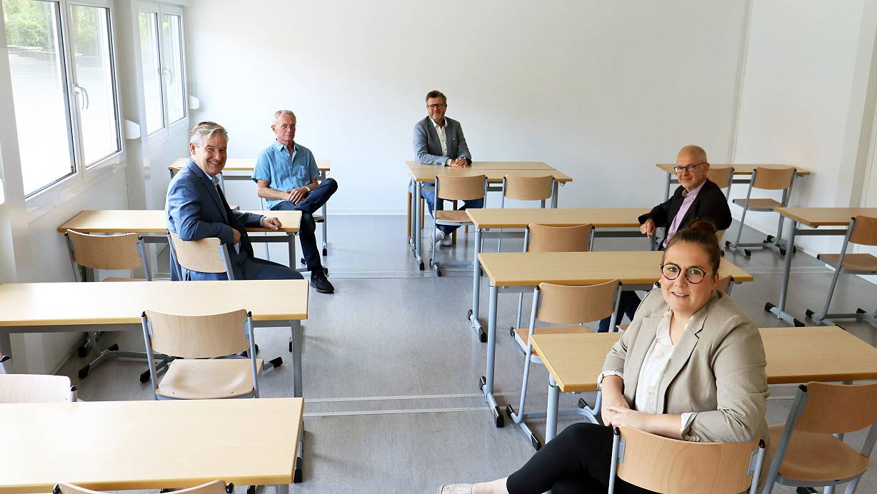 Probieren gemeinsam die neuen Räumlichkeiten aus (v.l.): Bürgermeister Michael Berens, Hausmeister Heribert Ludwig, Schulleiter Jochen Welschmeier, Bauamts-Mitarbeiterin Lena Kipshagen und Hauptamts-Leiter Thorsten Langemeier. | © Gemeinde Hövelhof