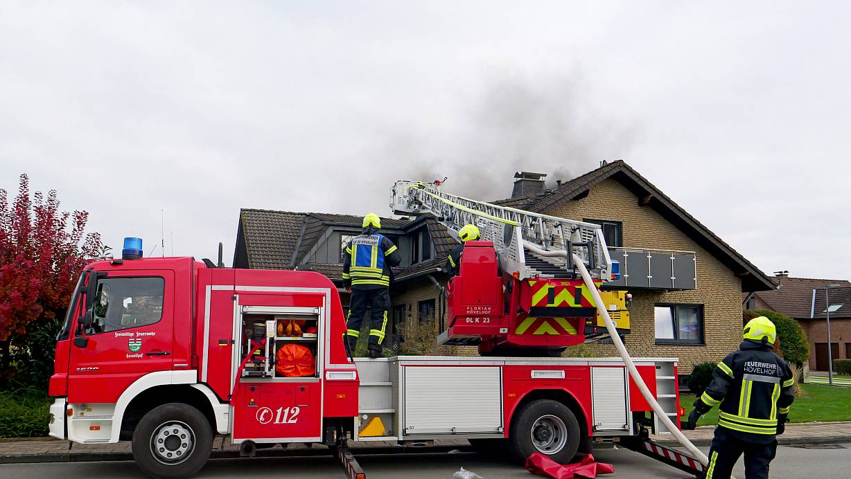 Rund 55 Feuerwehrleute aus Hövelhof und Delbrück bekämpfen einen Dachstuhlbrand bei einem Hövelhofer Bungalow. | © Ralph Meyer