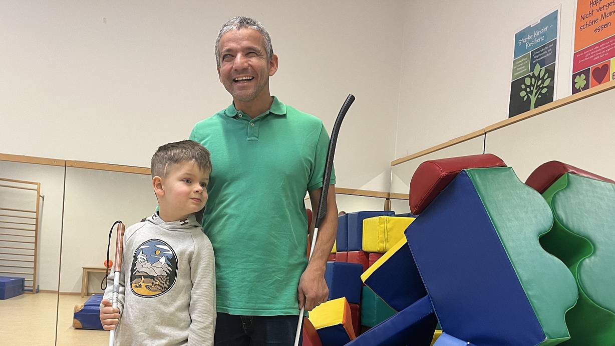 Der Mobilitätstrainer Juan Ruiz übt mit dem Fünfjährigen. Bei einer Spendensammlung für die Ausbildung von Finn Bee und einem weiteren erblindeten Kind ist viel Geld zusammengekommen.