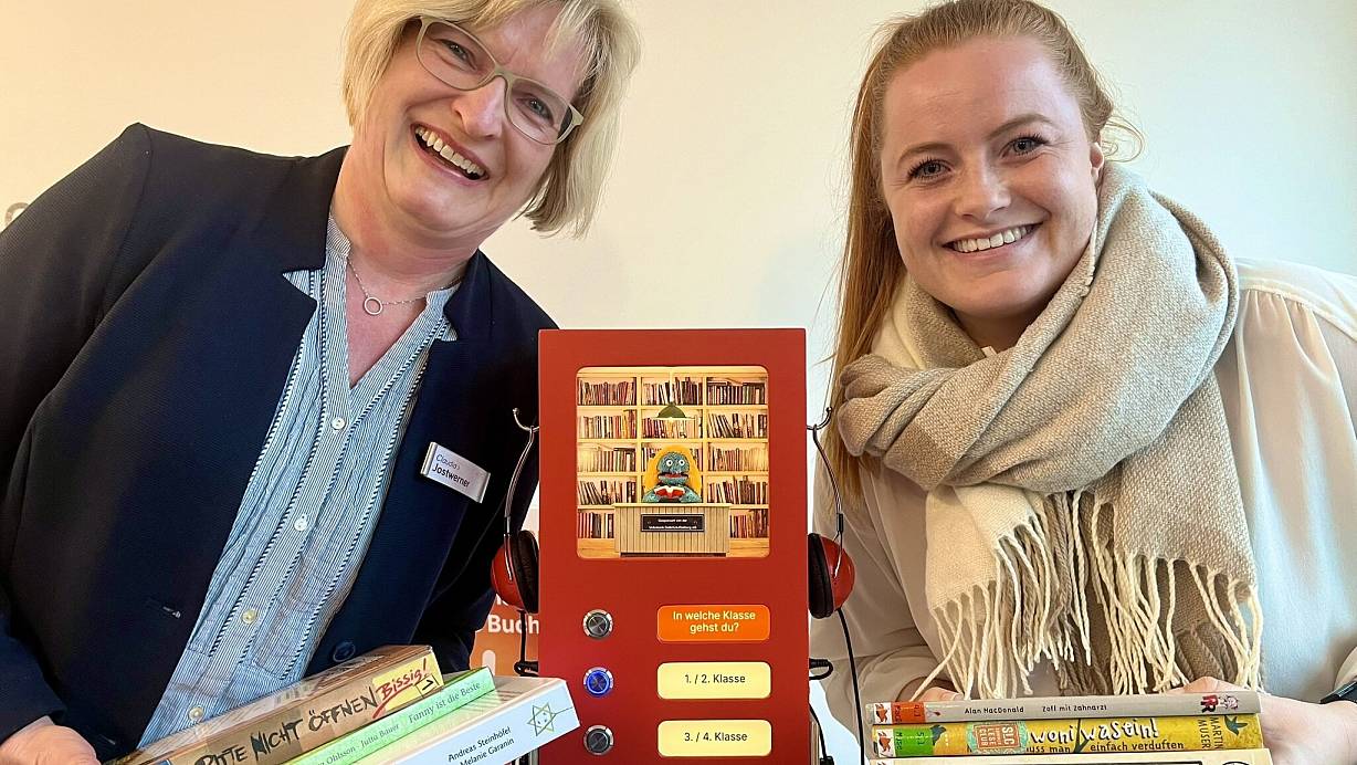 „Wir merken, dass Kinder oft trotz des großen Angebots nicht so einfach das Richtige für sich finden“, erklärt Büchereileiterin Claudia Jostwerner. Sie ist begeistert vom Buchfindomat-Konzept, das die Berlinerin Tina Kemnitz entwickelt hat. Die Literaturvermittlerin hatte in der Pandemie zunächst eine Online-Empfehlungsplattform aufgebaut – jetzt gibt es ganz handfeste Kisten mit Druckknöpfen zum Auswählen von Vorschlägen.