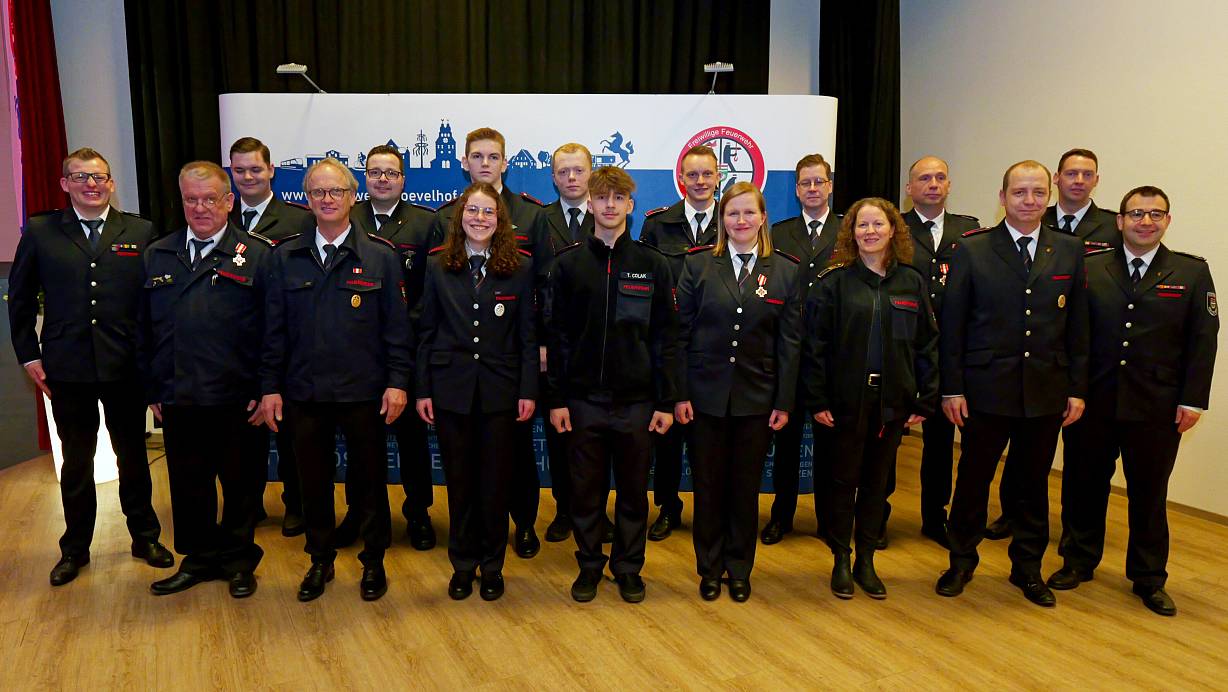Die frisch Beförderten und Geehrten der Feuerwehr Hövelhof zusammen mit Wehrführer Sebastian Lienen (l.) und den Stellvertretern Maximilian Rempe (2. v. r.) und Patrick Falkenrich (r.) . | © Ralph Meyer