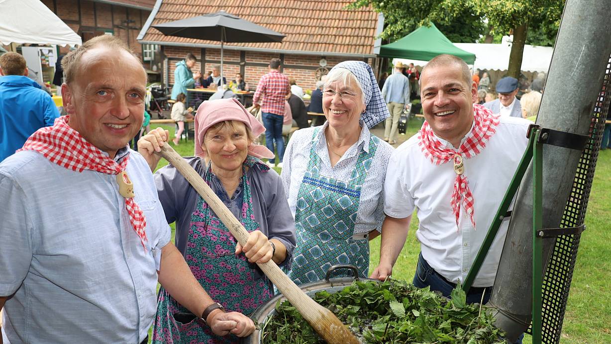 Carsten Tegethoff, Renate Regier, Maria Jacob und Volker Höddinghaus (v.l.) vom Plattdeutschen Kreis freuen sich über das gelungene Jubiläumsfest. Die Frauen zeigen, wir früher in einem „Bruggepott“ ein Brennnesselsud zum Färben von Wolle gekocht wurde. | © Regina Brucksch