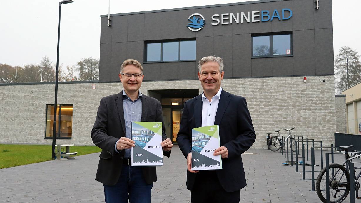 Bürgermeister Michael Berens (r.) und Kämmerer Andreas Schwarzenberg präsentieren den Haushaltsentwurf 2025 vor dem neuen Sennebad – einem Paradebeispiel für den besonderen „Hövelhofer Weg“. | © Gemeinde Hövelhof
