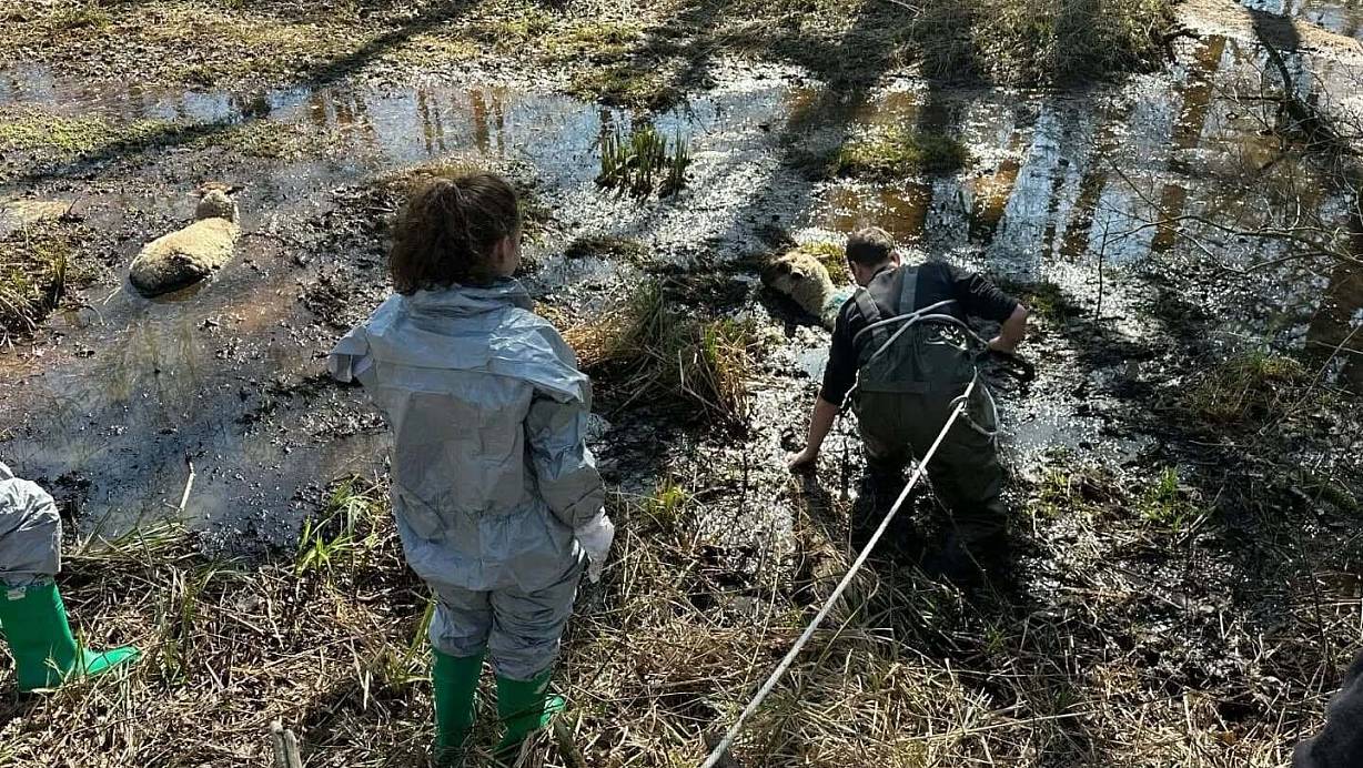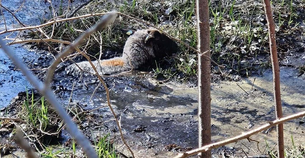 Insgesamt fünf Schafe bleiben im sumpfigen Boden stecken und besonders die Alttiere versinken im Schlamm. Rettung kommt durch die Feuerwehr.