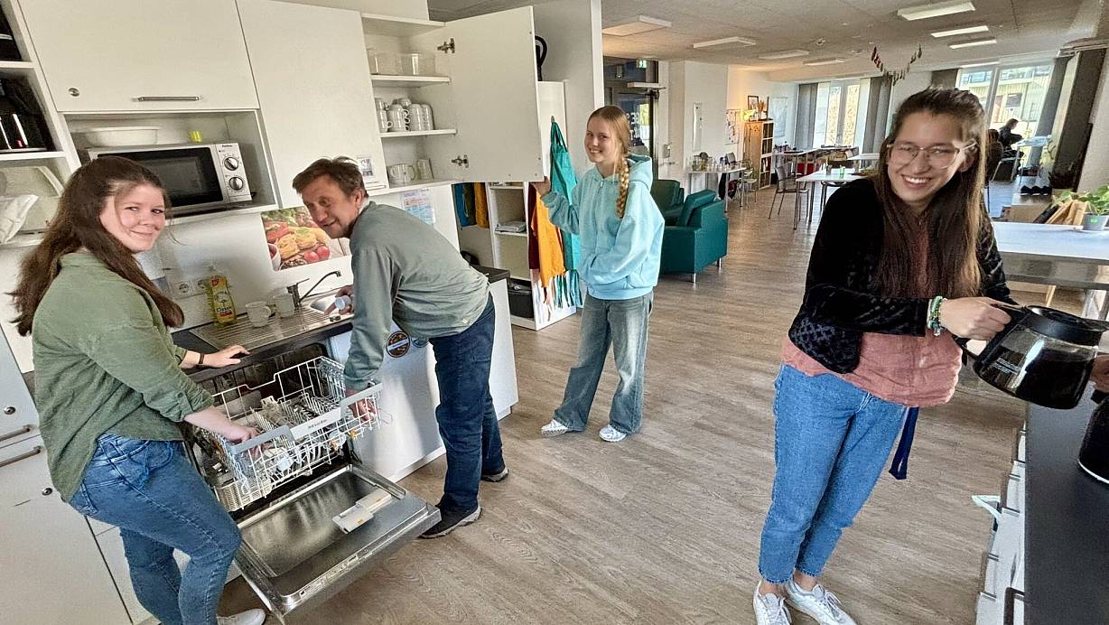 In der Küche der Tagesstruktur Hövelhof sorgen (v. l.) Bereichsleiterin Hanna Lütkemeier, Alfred Janocha, Betheljahr-Mitarbeiterin Solveig Severin und Ergotherapeutin Sithai Tiengwan für Ordnung. | © Jens Reddeker