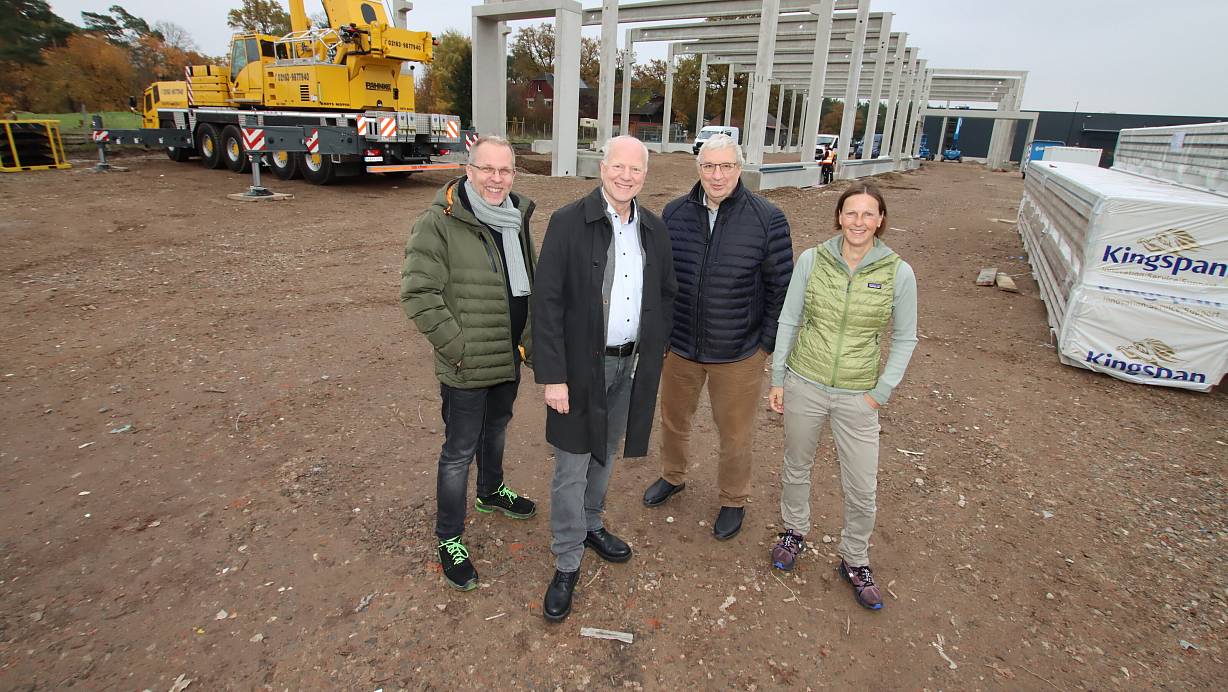 Ingenieur Arnd Bohlmann, Bürgermeister Olaf Junker, Gutachter Roland Murschall und Investorin Melanie Höveler am Baufeld. Im Hintergrund ist das Ausmaß der neuen Halle schon gut zu erkennen. | © Sigurd Gringel