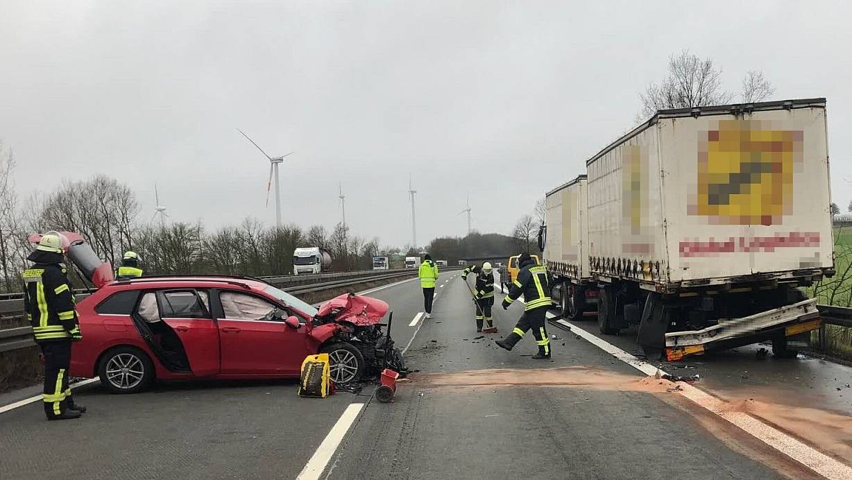 Rund zwei Stunden später kam es dann zum Unfall: Eine 28-jährige Frau aus Brandsfeld fuhr gegen 10.30 Uhr mit ihrem VW auf der A 44 in Fahrtrichtung Dortmund. Aus bislang ungeklärter Ursache kollidierte sie mit dem Auflieger des Lkw auf dem Seitenstreifen. Unmittelbar nach der Kollision fuhr eine nachfolgende Bulli-Fahrerin in die Unfallstelle.