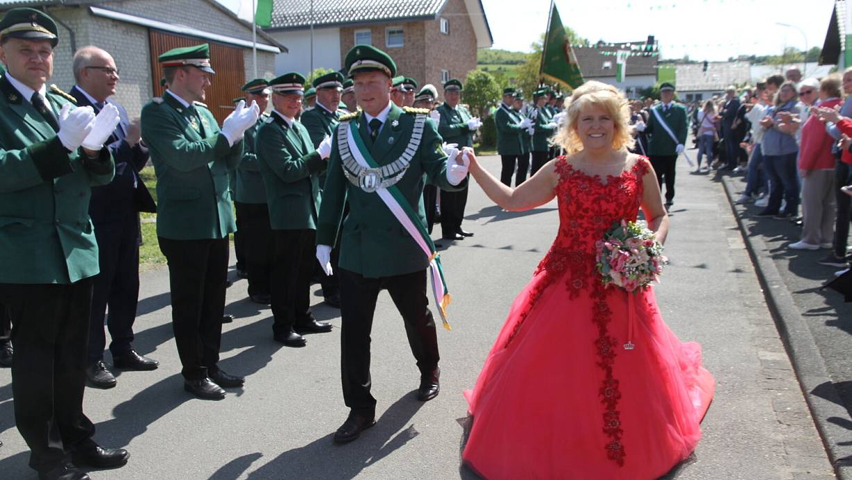 Lichtenau-Henglarn. Auch die Sonne strahlte, als habe sie etwas nachzuholen. Endlich wieder Schützenfeste! Die Henglarner waren die Ersten, die im Kreisgebiet wieder ein „normales“ Schützenfest feiern konnten. Vorbei war im Altenaudorf das Warten. Viele Fahnen flatterten in der Frühlingsluft, Häuser und Straßen waren herausgeputzt und die Feierfreude stand Schützen, Musikern und dem Regentenpaar Annica und Raphael Grundmann mit seinem Gefolge ebenso ins Gesicht geschrieben wie den vielen Zuschauern.