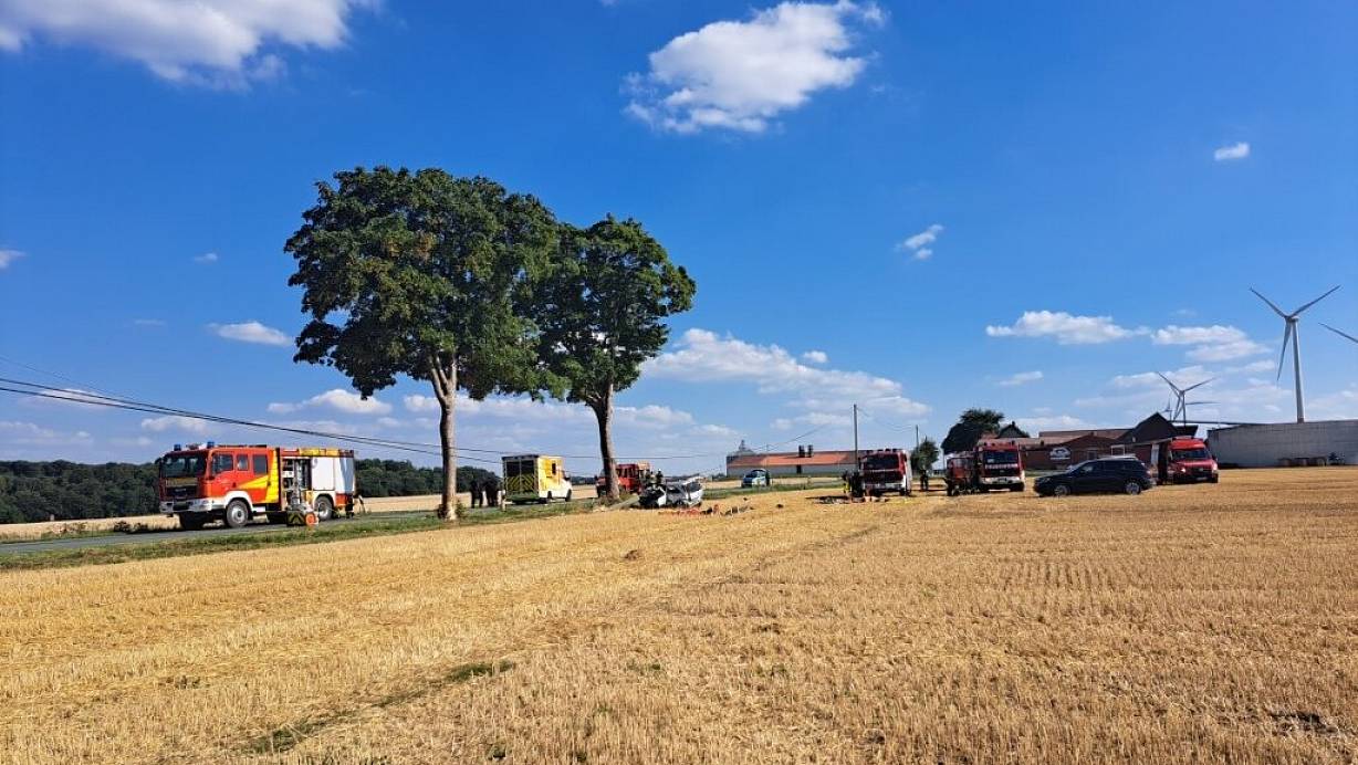 Ein PKW war nach bislang noch ungeklärter Ursache von der Fahrbahn abgekommen und mit einem Strommast kollidiert, dieser brach bei dem Unfall ab und das Fahrzeug kam auf einem Stoppelfeld zum Stehen. Der 24-jährige Fahrer wurde in dem völlig zerstörten Fahrzeug eingeklemmt, wie die Feuerwehr Marsberg berichtet. Trotz der sofort eingeleiteten Rettungsmaßnahmen sei für den jungen Fahrer jede Hilfe zu spät gekommen und er verstarb noch an der Unfallstelle. Zudem war das Stoppelfeld durch den Unfall in Brand geraten. Die schnell eingeleiteten Löschmaßnahmen zeigten aber raschen Erfolg.