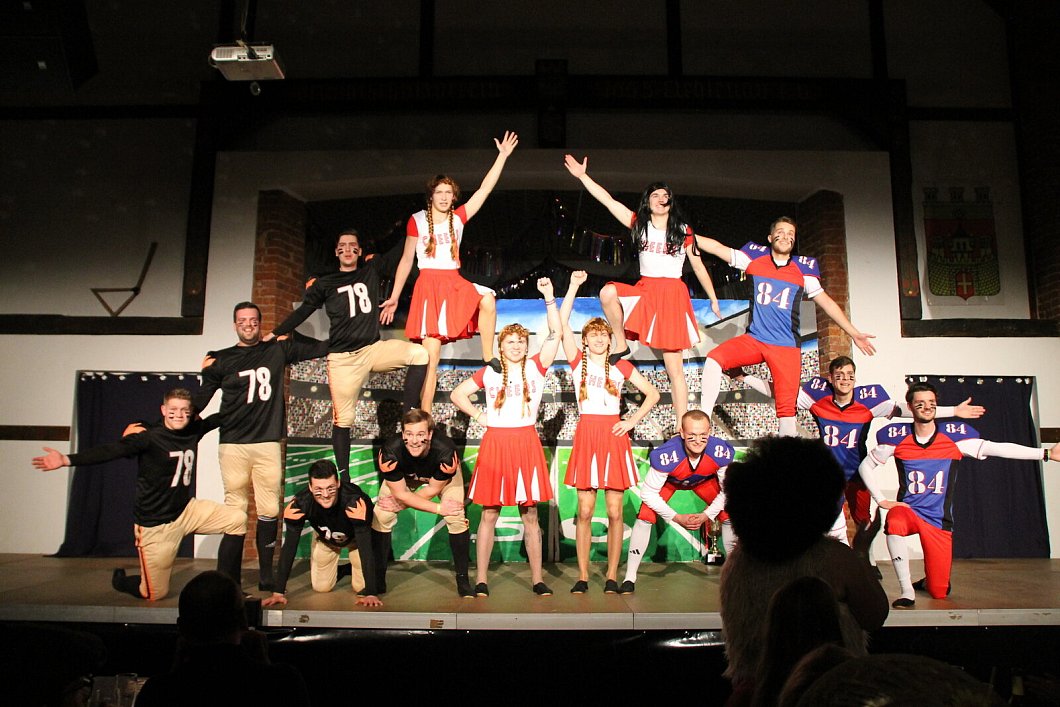 Das Männerballett, unter der Leitung von Lena Garrell und Annika Bunse, tanzte am Superbowl-Wochenende eben jenen Superbowl. Kraftvoll stellten sich die Herren in zwei Teams samt Cheerleader auf die in ein Stadion umfunktionierte Bühne und zündeten zum Abschluss des Abends ein Feuerwerk der Kreativität und tänzerischen Leistung ab.