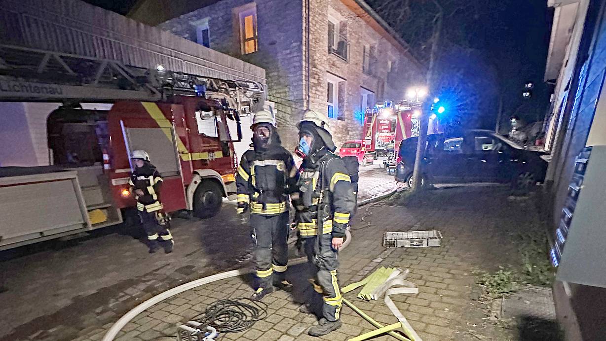 Unter Atemschutz durchsuchten die Feuerwehrleute das Gebäude an der Lichtenauer Glockenstraße nach weiteren Bewohnern. | © Feuerwehr Lichtenau