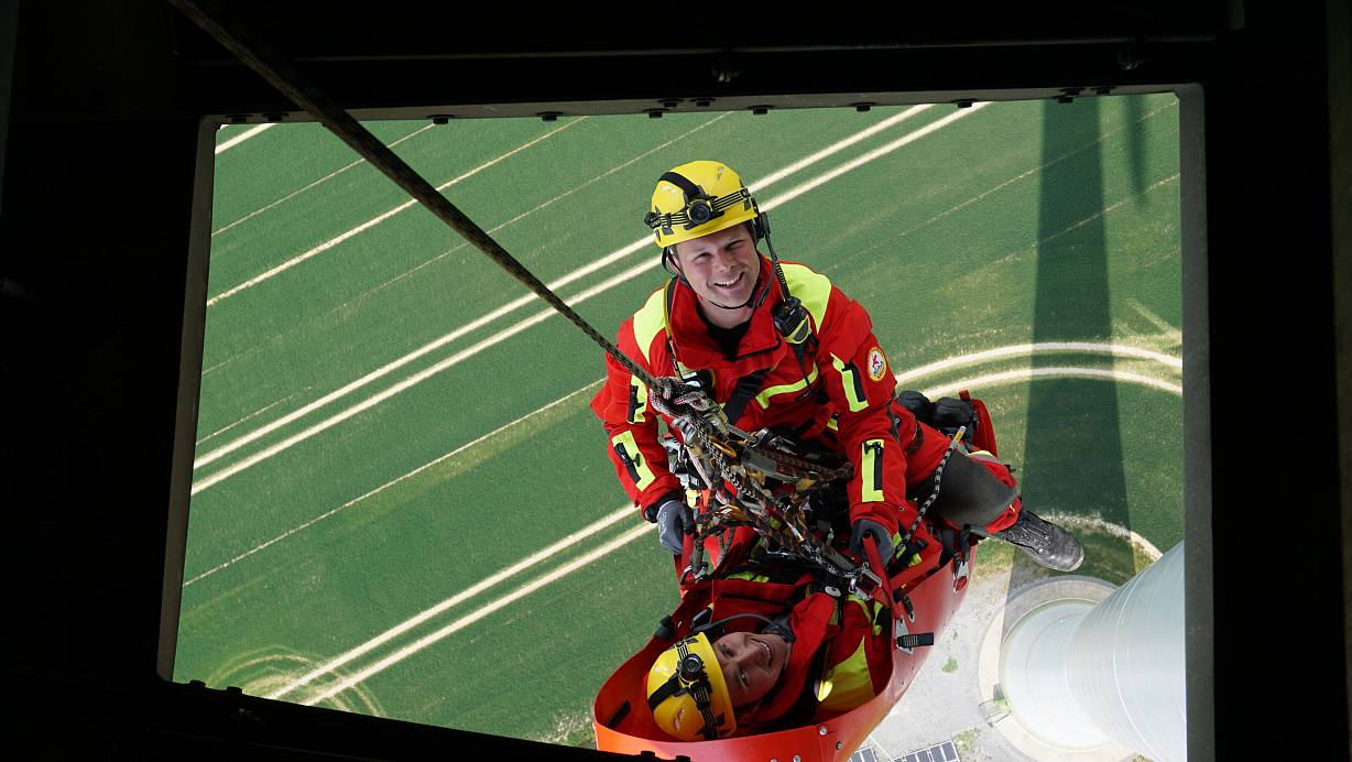 Angehende Höhenretter der Feuerwehr Paderborn meistern eine Übung auf einem Windrad. Dabei müssen sie einen Verletzten sogar aus einem Rotorblatt befreien.