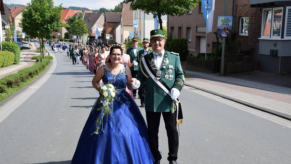 Das Königspaar Björn Seidel und Conny Stender präsentiert sicht in Kleinenberg den gutgelaunten Schaulustigen. | © Anja Ebner