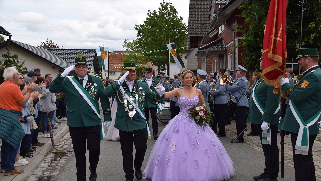 In dem Lichtenauer Ortsteil zieht das Königspaar Benedikt und Manuela Wieners beim großen Umzug zum Schützenfest vorbei an strahlenden Menschen. Besonders herausgeputzt ist ihre Residenz.