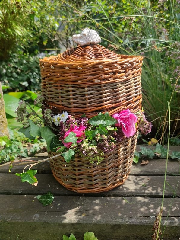 „Man kann Persönliches mit einflechten, wie zum Beispiel Lieblingsblumen. Meine erste Urne habe ich tatsächlich für jemanden geflochten, den ich kannte. Das war sehr emotional. Ich habe bei jedem Weidenschlag an die Person denken müssen. Es war aber auch sehr schön, mit meiner Kunst dieser Person etwas Besonderes auf die letzte Reise mitzugeben. Der Tod gehört zum Leben dazu und mit einer individuell gestalteten Urne wird der letzte Gang zu etwas sehr persönlichem“, sagt Gensch, die auch geflochtene Grabkreuze anfertigt.