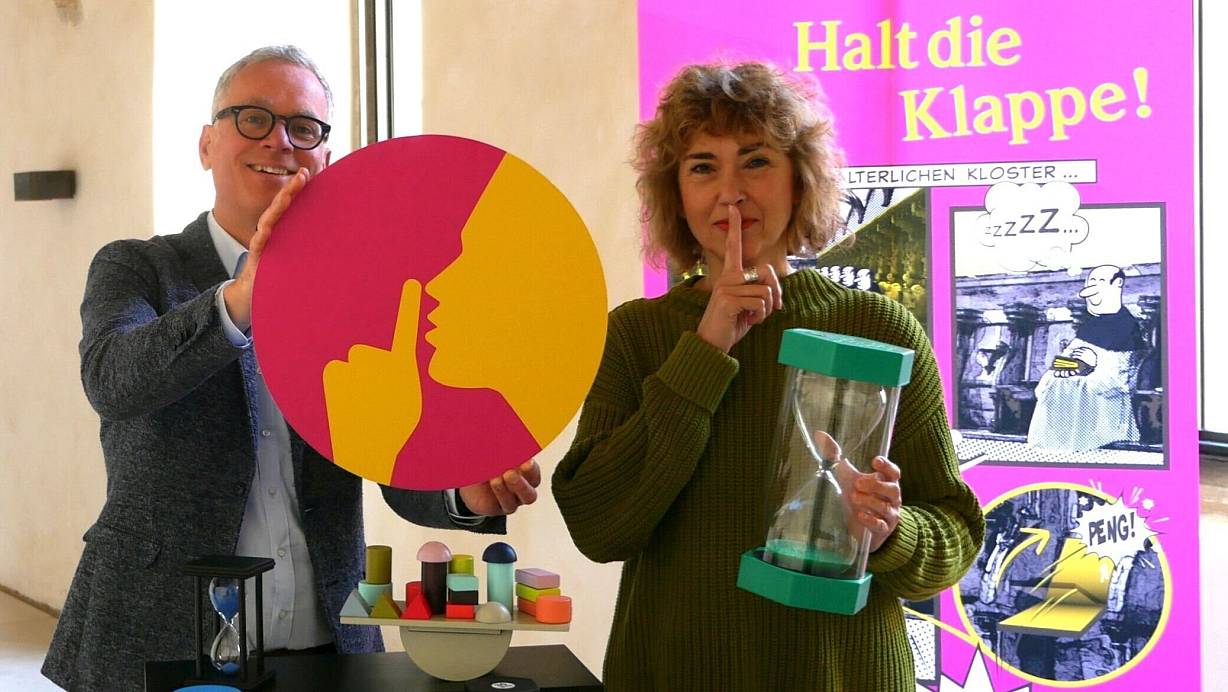 Im Kreuzgang erfahren Museumsgäste, wie lang sich eine Minute ohne Worte anfühlen kann, und was Dichter und Denker über das Schweigen zu sagen haben. Bei einem Balance-Tischspiel und auf einem Balance-Brett üben sie sich in Geduld, Ausgeglichenheit und Geschick.