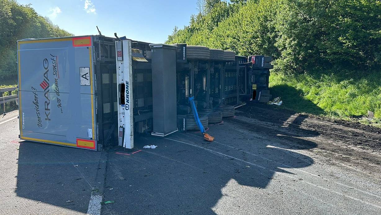 Die Unfallursache stehe noch nicht fest. Der Fahrer des Lkw sei rechts von seiner Spur abgekommen, lenkte dann wohl plötzlich gegen, wodurch das Fahrzeug ins Schleudern geriet und schließlich umkippte. Dabei sei nur der Fahrer leicht verletzt worden.