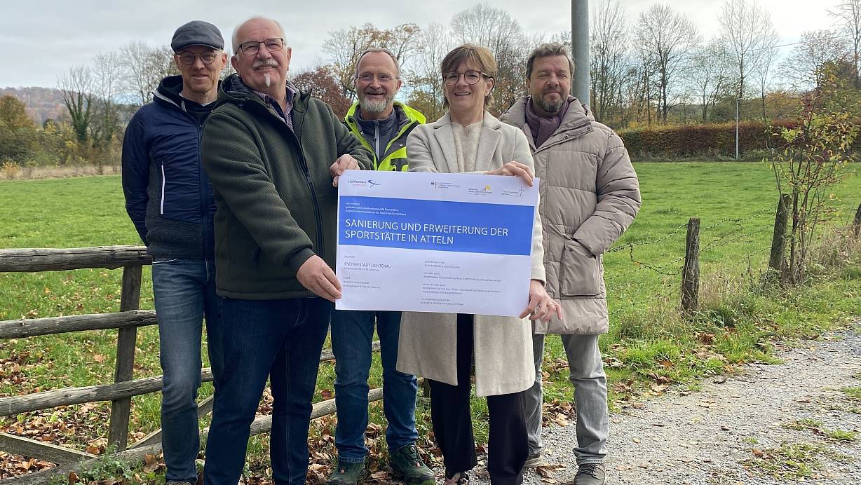 Rüdiger Düchting vom USC Altenautal (v.l.), Franz Münstermann von der Bürger- und Energiestiftung Lichtenau, Peter Henkst von "Henkst Verkehrstechnik", Bürgermeisterin von Lichtenau Ute Dülfer und Daniel Sélea von der schwedischen Firma "Prismatibro" präsentieren die neue Walking-Strecke. | © Selin Meier