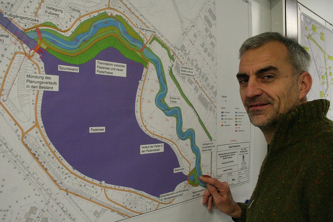 Durch die geplante Nordumfließung der Pader in Richtung Fürstenallee schrumpft die Fläche des Padersees um etwa sieben Prozent, sagt Schröder. Um diese Fläche wachse zugleich wiederum der vorhandene Naherholungsbereich am See. Ab Mitte Juni 2016 wird in dem entsprechenden nördlichen Abschnitt des Padersees südlich des Padercafés eine Menge Erdreich aufgeschüttet – hierdurch verläuft die Pader zukünftig. Im südlichen Teil dieser zusätzlichen Naherholungszone wird dabei ein neuer Weg angelegt. Beim Bau eines Dammes am neuen Seeufer wird dann wahrscheinlich eine Spundwand gesetzt, sagt Schröder. Die Details werden jedoch noch durch ein Geologiebüro aus Braunschweig überprüft. Während dieser Zeit wird die bisherige Runde um den Padersee vermutlich einige Zeit unterbrochen.