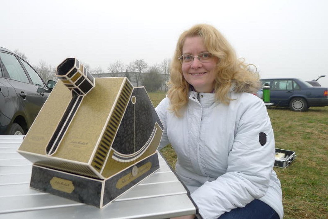 „Es gibt nur drei sichere Methoden, die Sonne zu beobachten“, erklärte Ulrike Neumann vom Ressort Kinder- und Jugendarbeit der Volkssternwarte. „Erstens die spezielle Sonnenfilter-Schutzfolie, die auch in den „Sofi“-Brillen zum Einsatz kommt. Zweitens besondere Glasfilter, die wir auch in der Sternwarte benutzen. Diese sind aber extrem kostspielig. Die dritte Variante ist die Projektionsmethode“, sagte Ulrike Neumann. Ein Sonnenprojektor aus Pappe fängt das Sonnelicht per Objektiv ein und spiegelt es doppelt. Das Bild der Sonne wird so ins Innere des Gehäuses projiziert und kann auf dem weißem Karton gefahrlos beobachtet werden.