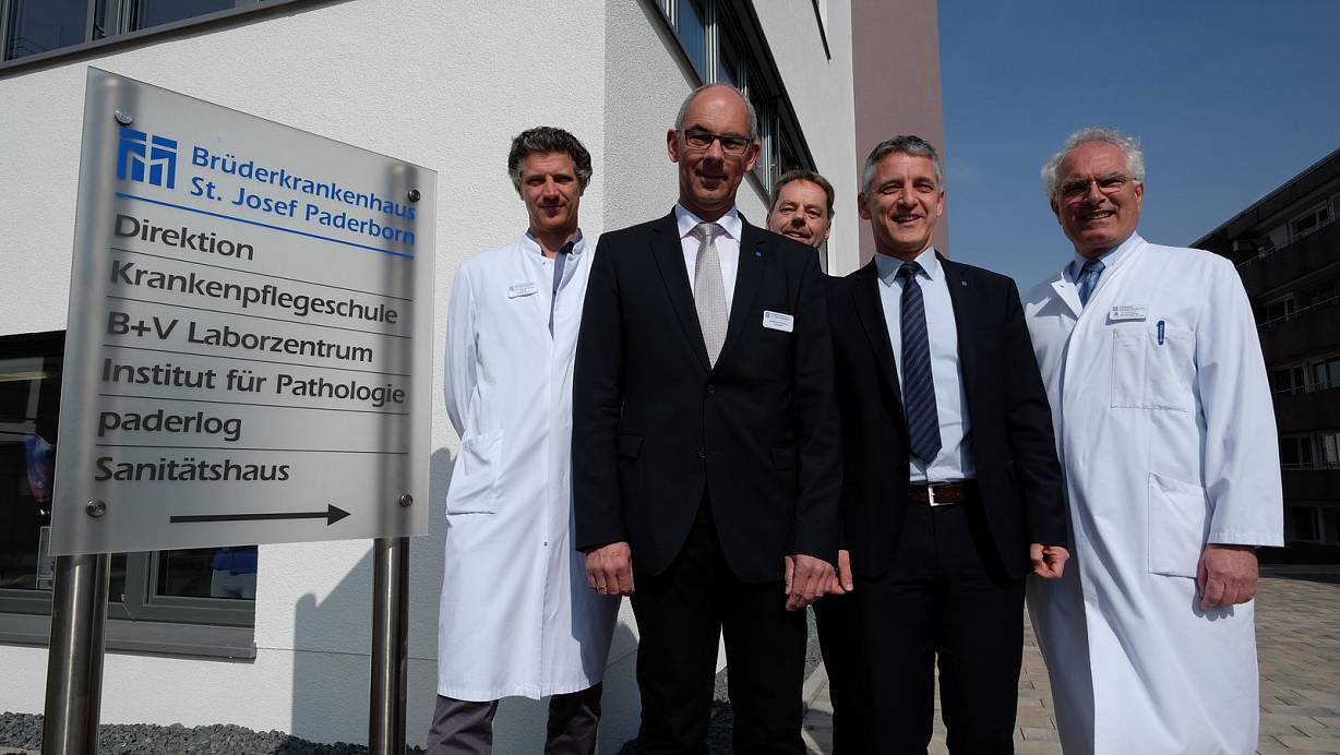 Vor dem Neubau freuen sich Marc Keberle (Ärztlicher Direktor, v. l.), Hausoberer Christoph Robrecht, Pflegedienstleiter Klaus Niggemeyer, Geschäftsführer Siegfried Rörig und Paderlog-Leiter Burkhard Backhaus. FOTO: HANS-HERMANN IGGES | © Hans-Herman Igges