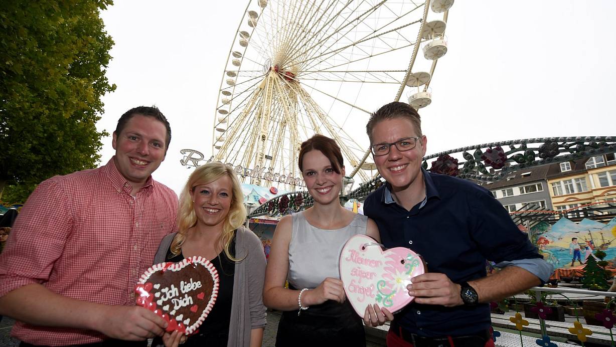 Freuen sich auf ein Menü im Riesenrad: (v. l.) Johannes Mollemeier, Sinje Knorrenschild, Nora Timmerberg, Dennis Happe. | © Marc Köppelmann