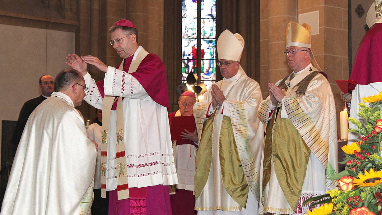 Hunderte Katholiken nehmen an der Bischofsweihe von Dominicus Meier teil. Erzbischof Hans-Josef Becker führt den Benediktiner in das Amt ein