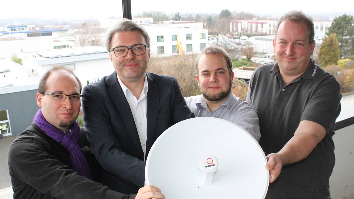 Maximilian Wilhelm, Freifunk Hochstift, Dr. Marc Jan Eumann, Staatssekretär des Landes NRW für Bundesangelegenheiten, Helge Jung, Freifunk Hochstift und Sascha Fleiß, Geschäftsführer von Vega Systems nehmen sich die digitale Vernetzung des Hochstiftes vor. | © Christian Geisler