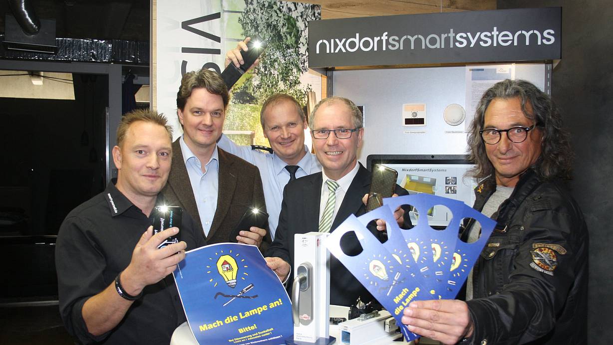 Machen die Lampen an: (v.l.) Michael Vollstedt, Walter Nixdorf ( Smarthome), Kriminalhauptkommissar Randolf Latusek, Landrat Manfred Müller und Künstler Herman Reichold. | © B. Berbüsse