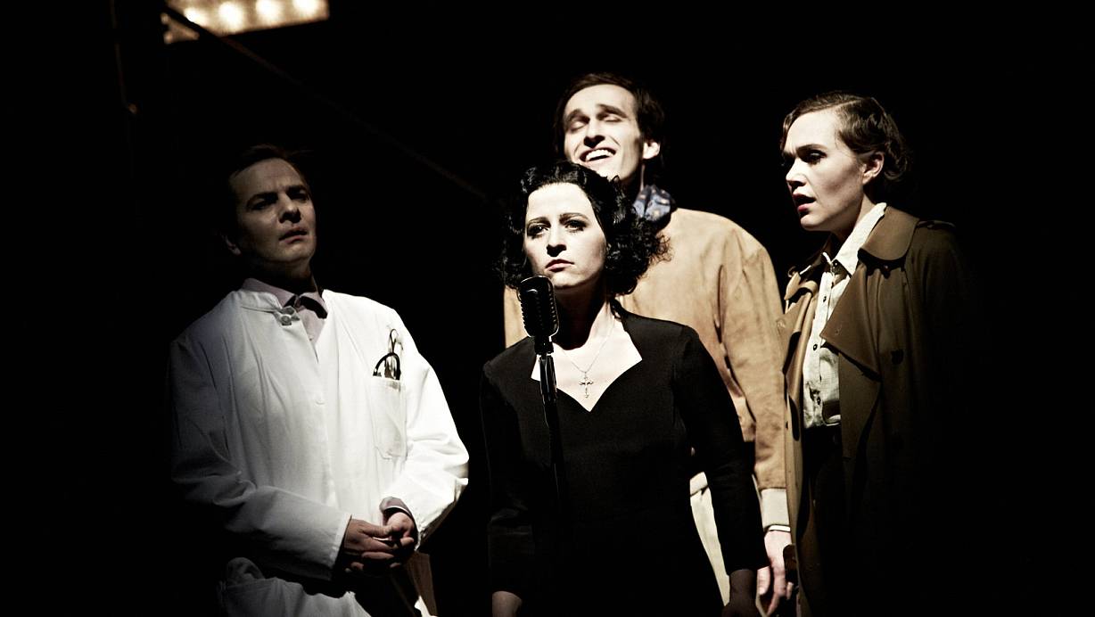 Alle Preisträger auf einem Bild: (vorne v. l.) Alexander Wilß, Anne Bontemps und Natascha Heimes mit Lars Fabian in „Piaf. Keine Tränen". Zwei Spielzeiten lang gehörte das Stück zum Repertoire und avancierte zum Publikumshit. Da die Premiere in der Spielzeit 2014/15 war, flossen die Leistungen in die Abstimmung nicht mit ein. | © Meinschäfer