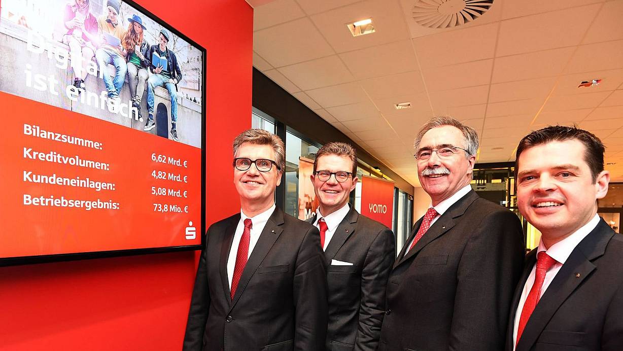 Vorstandsvorsitzender Hans Laven (2. v. r.) mit den Vorstandsmitgliedern (v. l.) Hubert Böddeker, Arnd Paas und Andreas Trotz. Sie blicken zufrieden auf eine planmäßig verlaufene Geschäftsentwicklung der Sparkasse mit stabiler und solider Ertragslage zurück. | © Marc Köppelmann