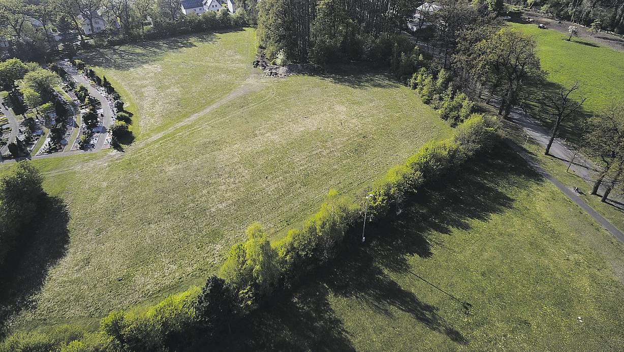 Blick von oben: Auf der Wiese unterhalb und in der Breite des kleinen Wäldchens (bisher Erweiterungsfläche des Friedhofs links) soll die Kita gebaut werden. Pkw-Stellplätze entstehen auf einem kleinen Teil der benachbarten Wiese, die zum Schützenplatz gehört; der Bereich befindet sich an der Ecke rechts unterhalb der Baumreihe. Rechts verläuft der Bohlenweg, hinter dem Wäldchen ist die Gesamtschule Elsen. | © Marc Köppelmann