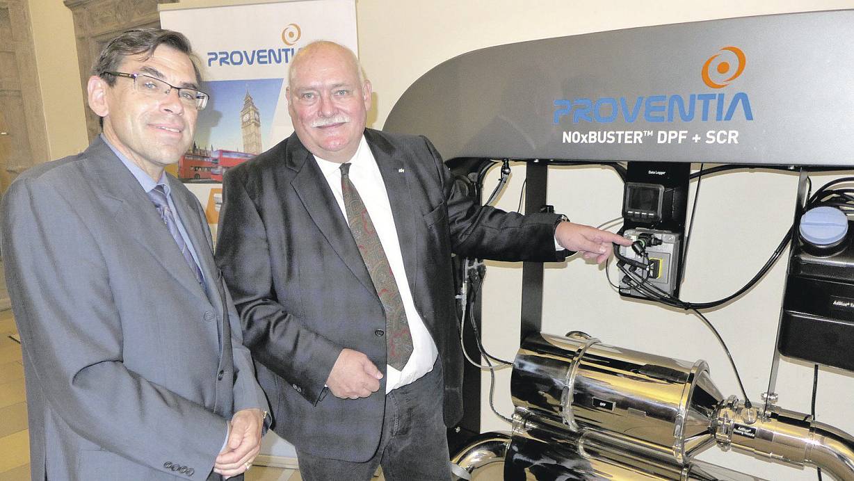 Am Modell in Originalgröße: Padersprinter-Geschäftsführer Peter Bronnenberg (r.) und Professor Ralph Pütz stellten Funktionsweise und Messergebnisse der neuen Filtertechnik für mit Diesel betriebene Busse vor. | © Hans-Hermann Igges