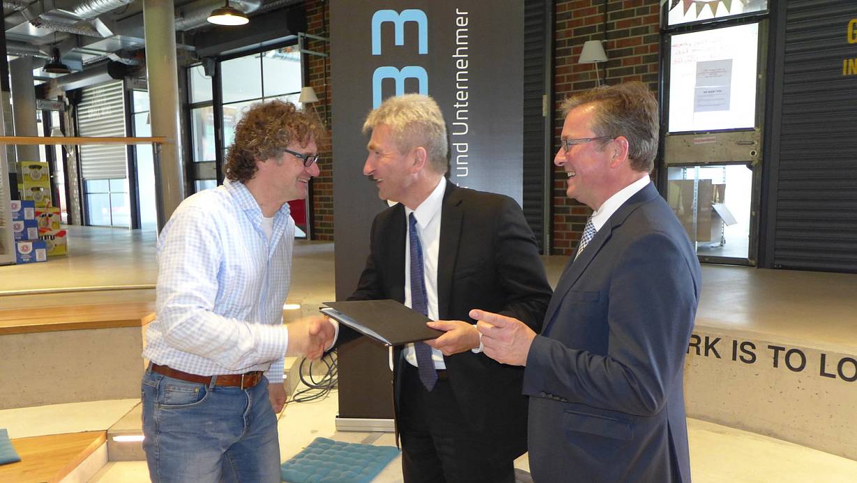 Grund zur Freude: Bürgermeister Michael Dreier (r.) und Uni-Vizepräsident Rüdiger Kabst (l.) erhielten von Minister Andreas Pinkwart den in eine schwarze Kladde verpackten Förderbescheid für Garage 33. | © Hans-Hermann Igges