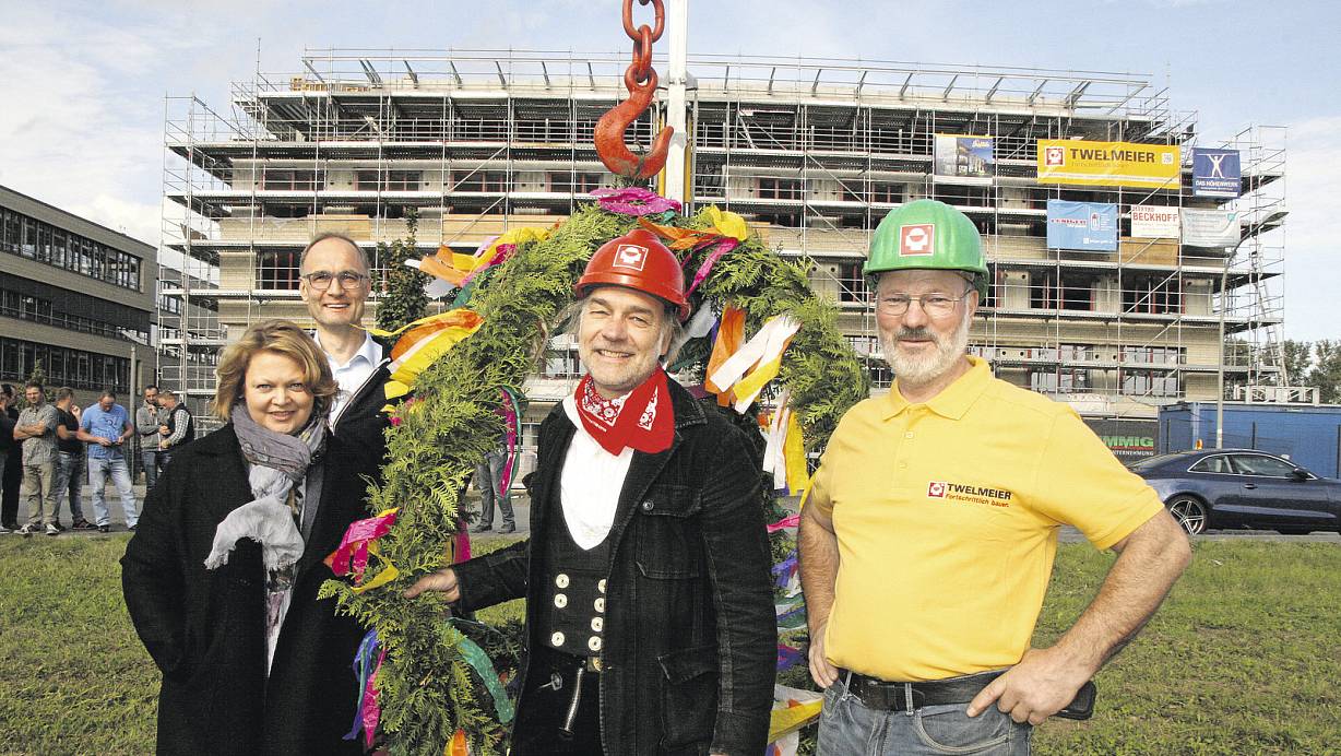 Das Lob des 49-Jährigen wird sicher auch den Geschäftsführer der ausführenden Baugesellschaft Twelmeier GmbH gefreut haben. Zünftig in Zimmererkleidung ging Nils Twelmeier denn auch der obligatorische Richtspruch am Freitag dann ganz besonders flott über die Lippen.