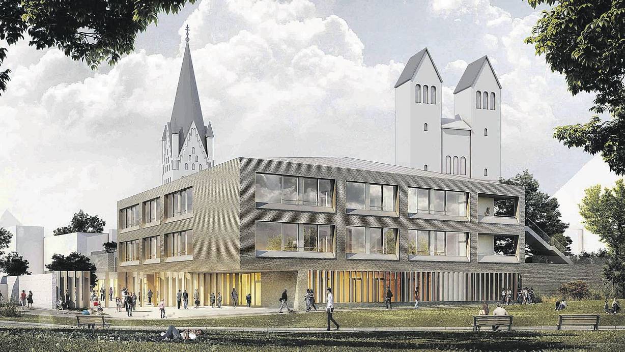 Hingucker im Stadtbild: So soll das die neue Grundschule auf dem Gelände der Michaelsschulen einmal aussehen. Diese Visualisierung zeigt den Blick vom Paderquellgebiet auf das dreistöckige Gebäude. Im Erdgeschoss befinden sich die Verwaltungsräume, darüber sind zwei Lernetagen für jeweils vier Jahrgänge vorgesehen. | © pdp