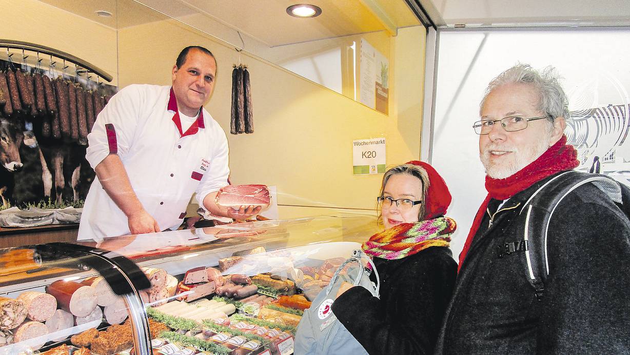 Endlich wieder am neuen alten Standort: Fleischermeister Manuel Ellermann bedient seine Stammkunden Nicoline und Andreas Kühn. | © Birger Berbüsse