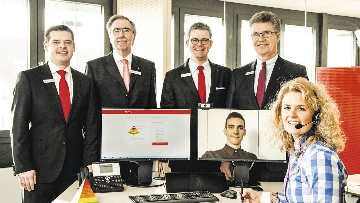 Via Internet: Stefanie Becker-Schütte (Leiterin Digitales Beratungs-Center) berät ihre Kunden am Bildschirm. Der Vorstand der Sparkasse Paderborn-Detmold, (v. l.) Andreas Trotz, Hans Laven, Arnd Paas und Hubert Böddeker, baut solche digitalen Angebote aus. | © Nicole Stüker